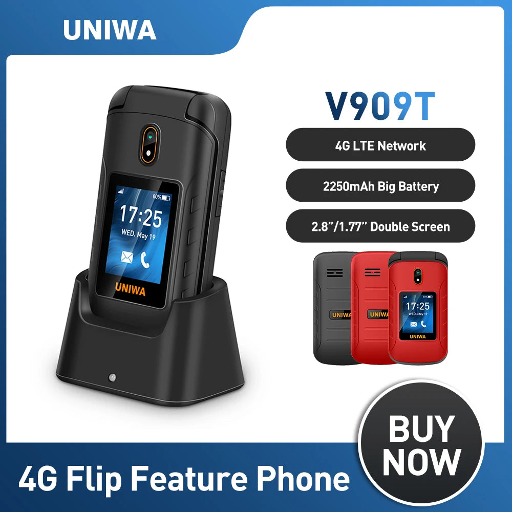 UNIWA V909T Big Push-Button 4G Flip Phone Dual Screen 0.3MP Camera FM Radio Russian Hebrew Keyboard 2250mAh Clamshell Cellphone